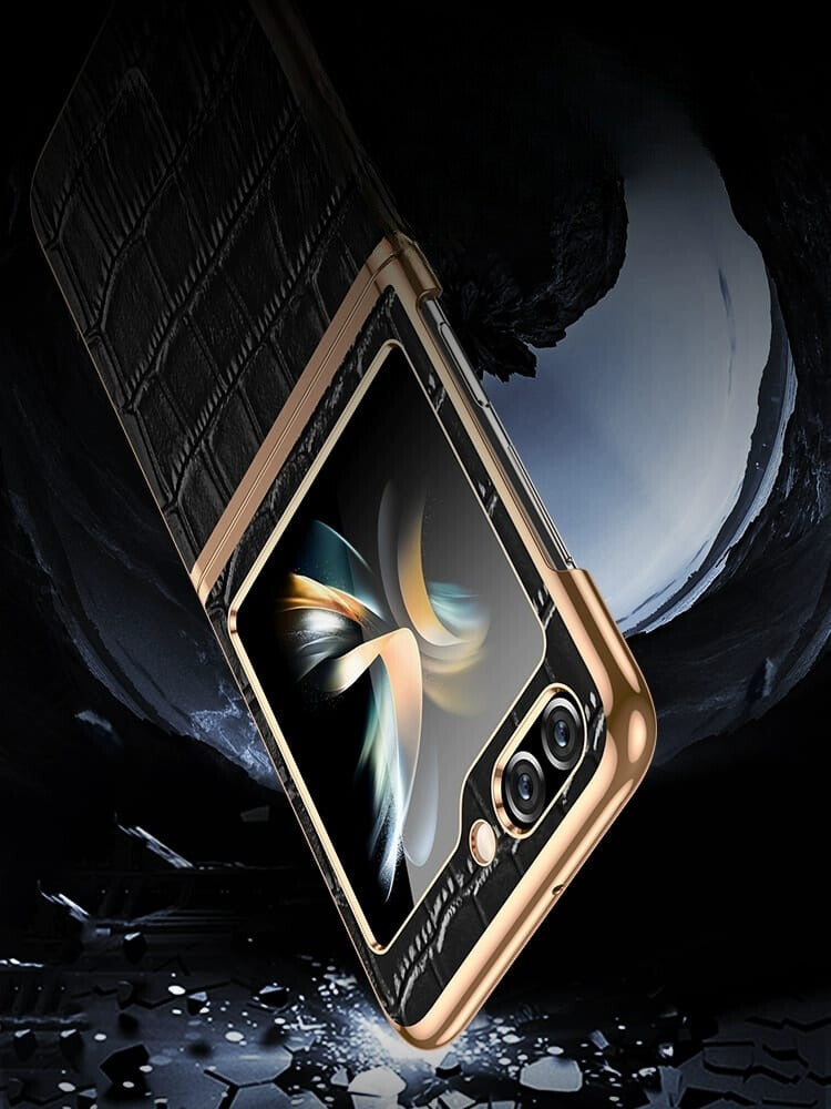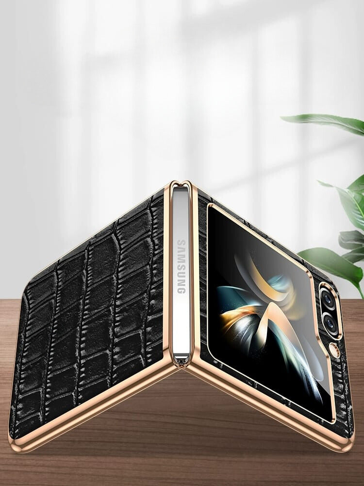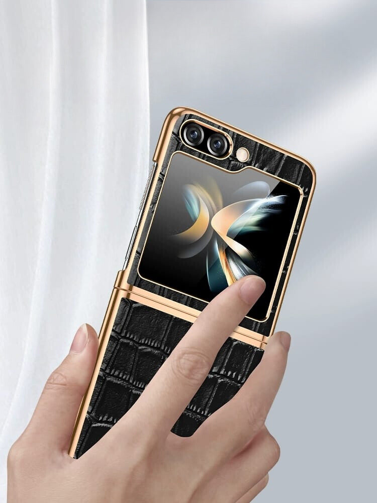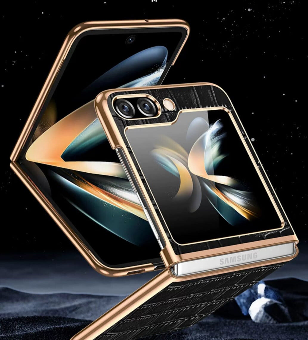 Gold Electroplated Croco Pattern Leather Luxury Case in a sleek new design for the Samsung Galaxy Z Flip 5 and Samsung Galaxy Z Flip 6.