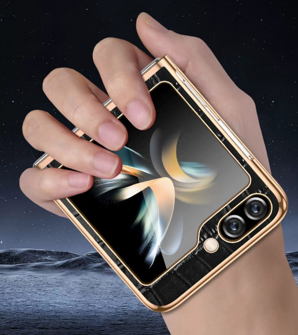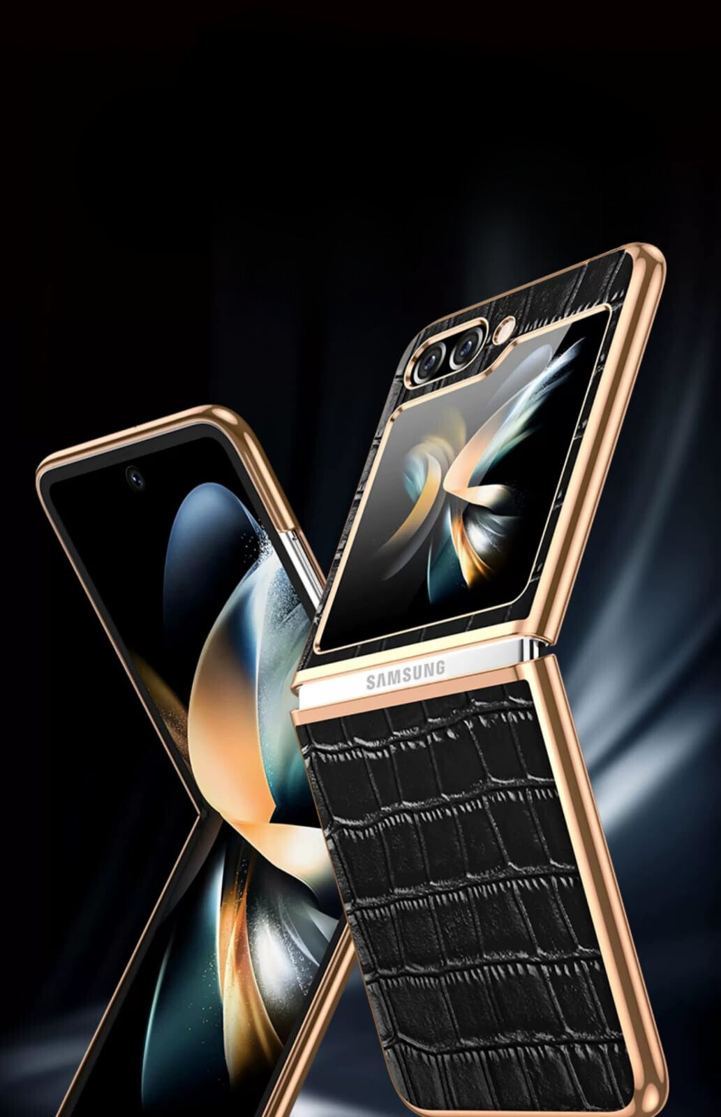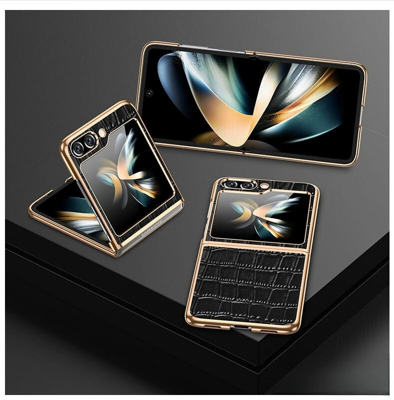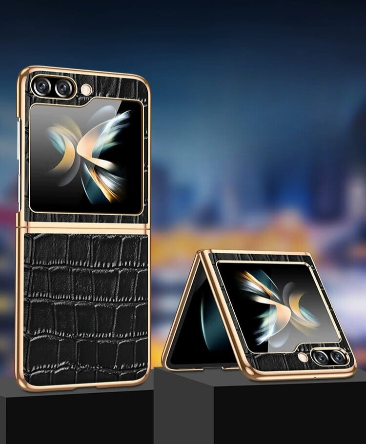 Gold Electroplated Croco Pattern Leather Luxury Case in a sleek new design for the Samsung Galaxy Z Flip 5 and Samsung Galaxy Z Flip 6.