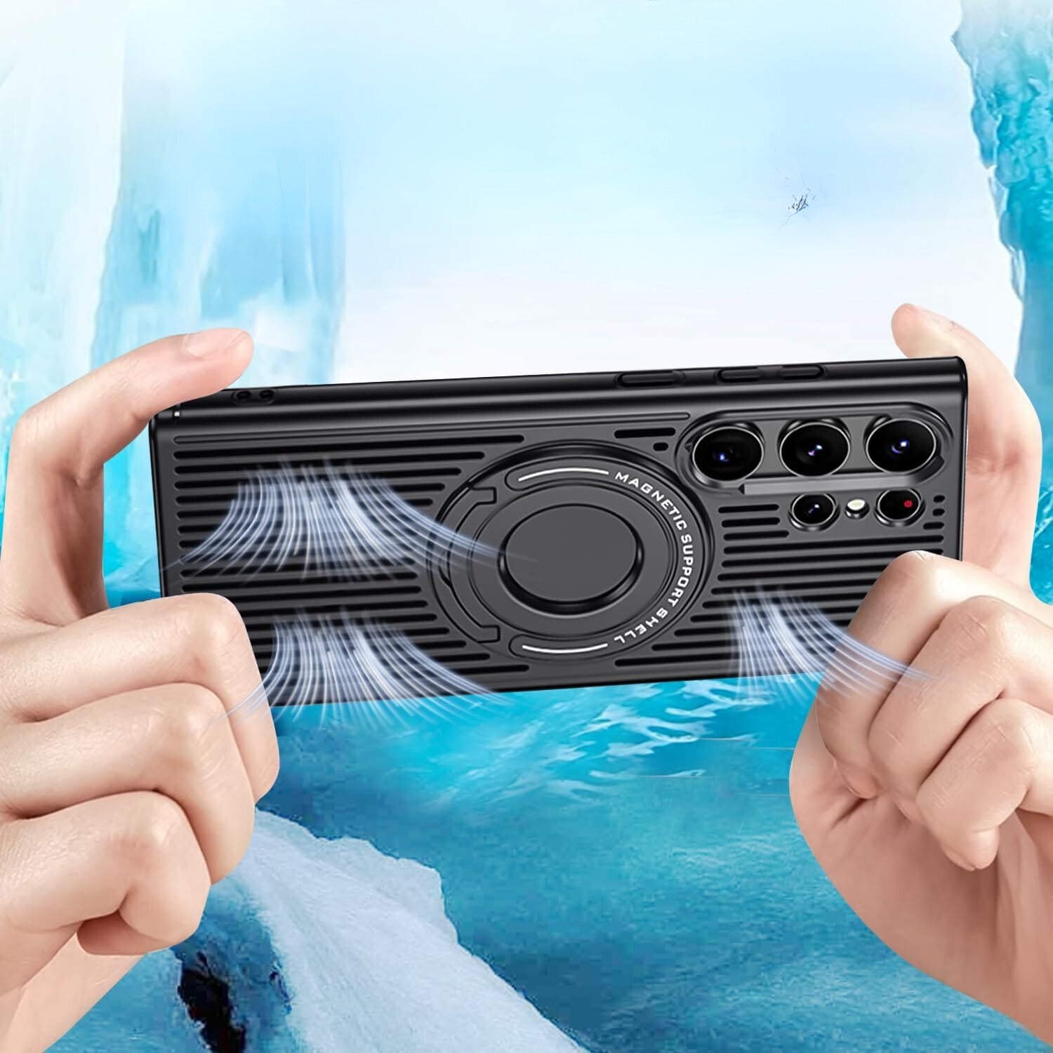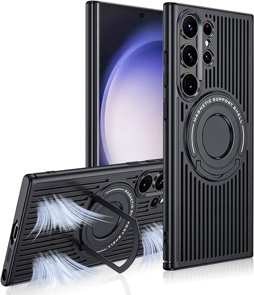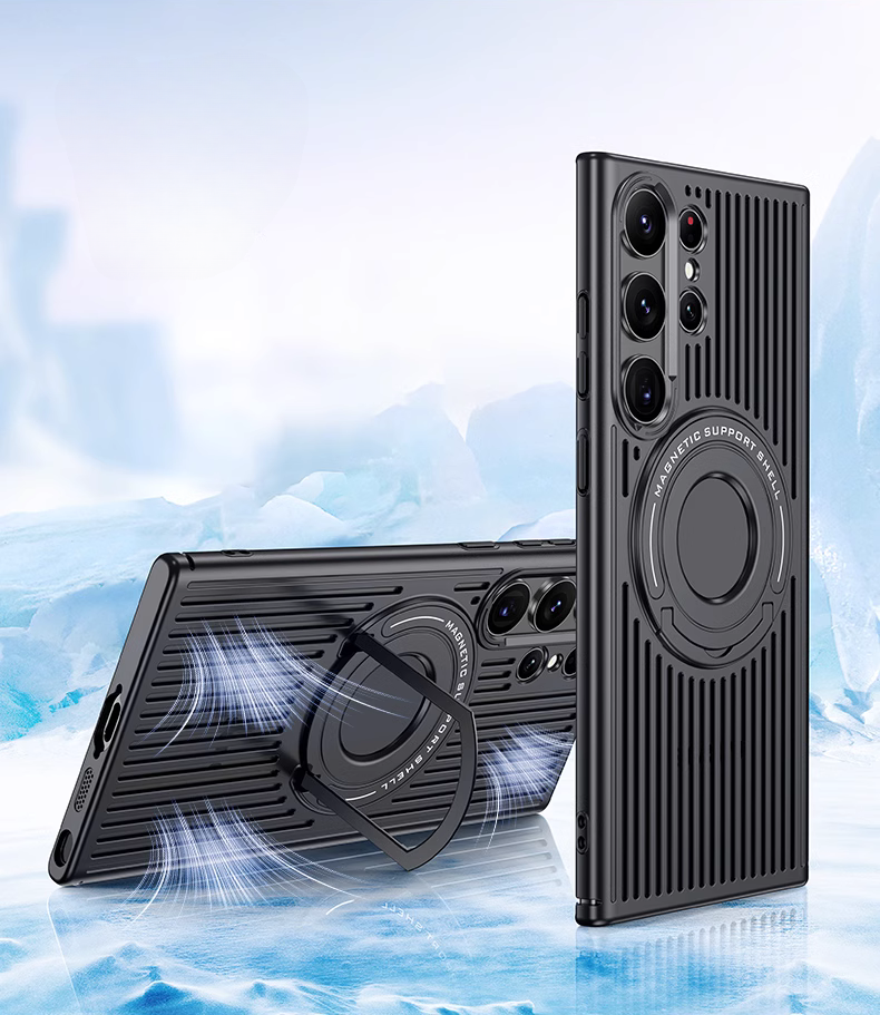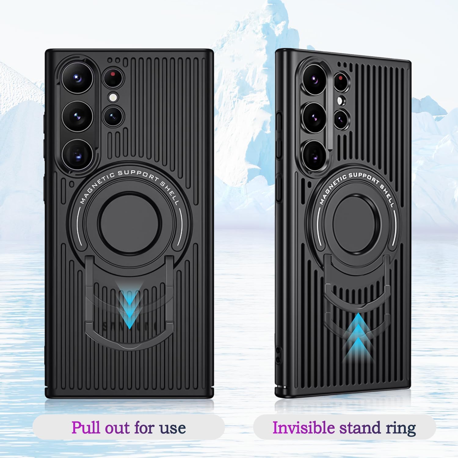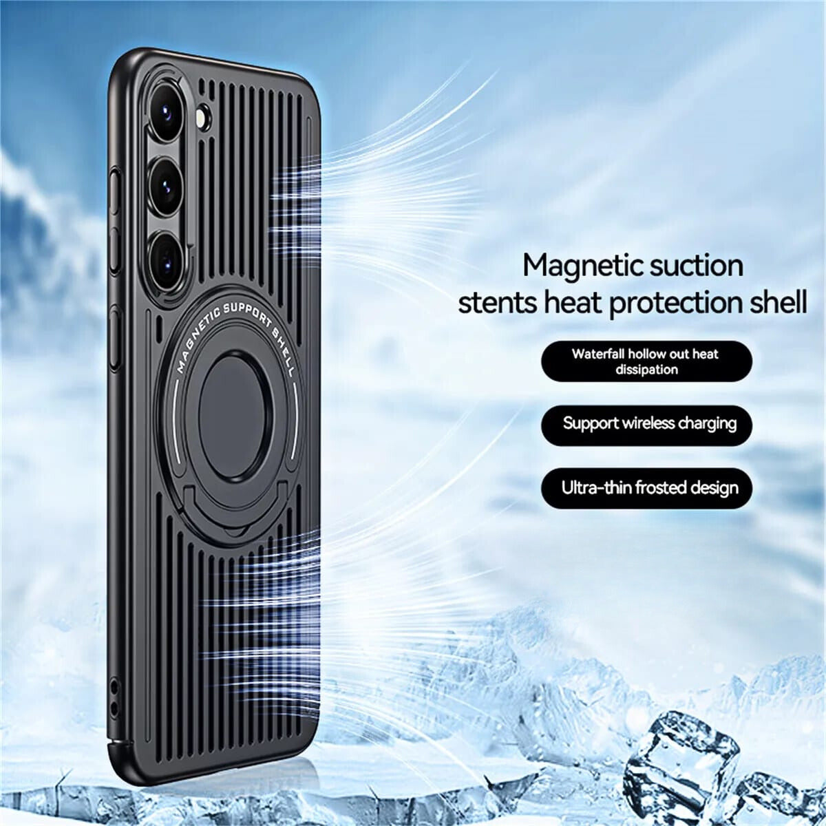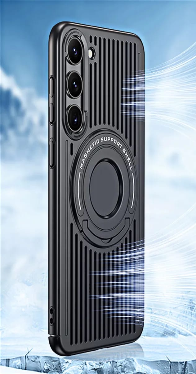 Jet black Heat Dissipation Magnetic Stand Cover in a sleek new design for the Samsung Galaxy S23, Samsung Galaxy S23 Plus and Samsung Galaxy S23 Ultra, Samsung Galaxy S24, Samsung Galaxy S24 Plus and Samsung Galaxy S24 Ultra