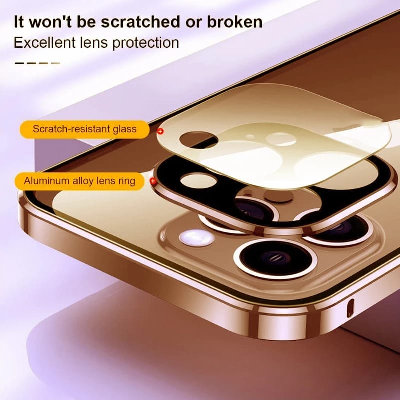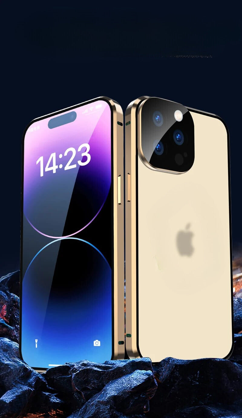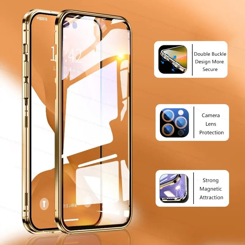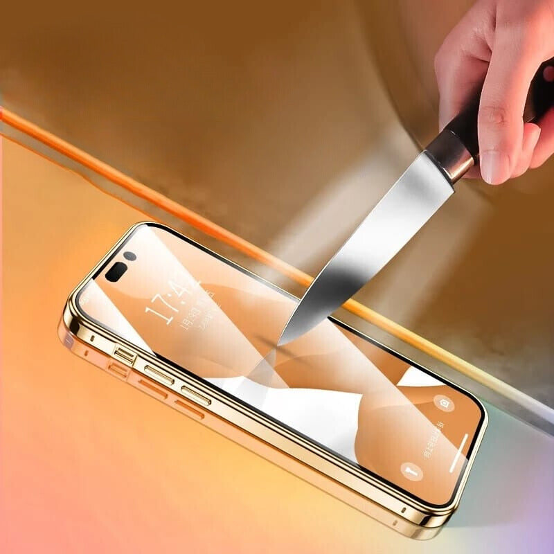 Grab this Premium Metallic Gold Plated 360 Degrees Protection Transparent Glass Cover in a sleek new design for iPhone 14, iPhone 14 Plus, iPhone 14 Pro, iPhone 14 Pro Max, iPhone 15, iPhone 15 Plus, iPhone 15 Pro, iPhone 15 Pro Max,
