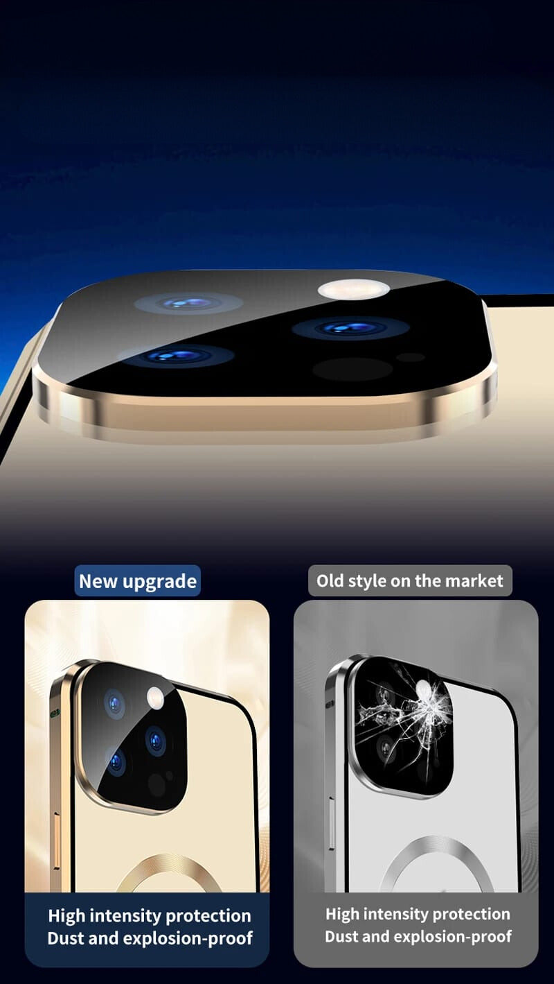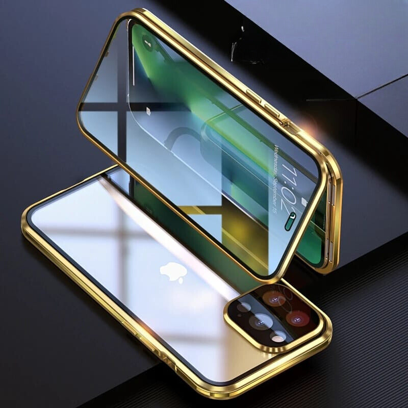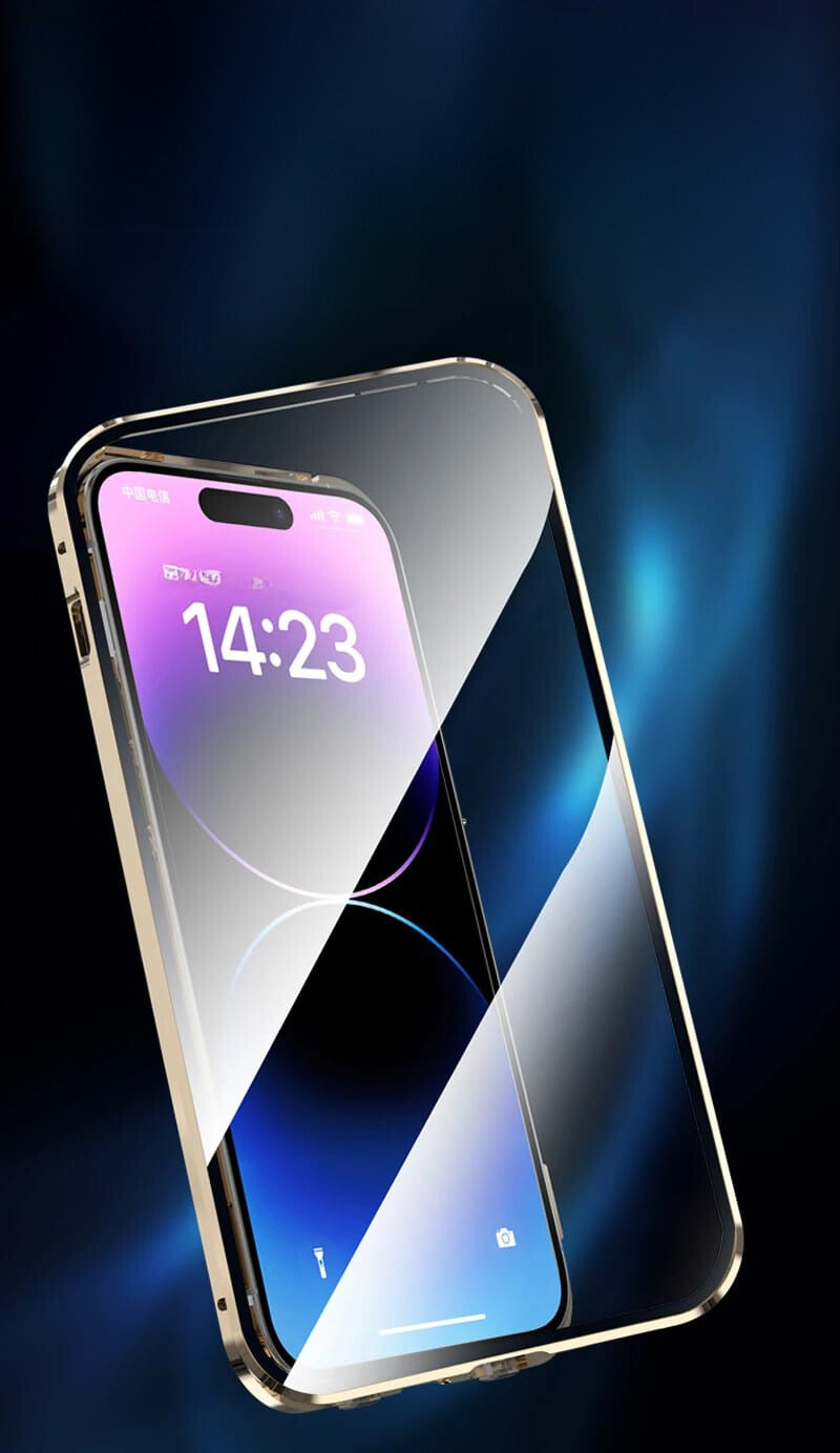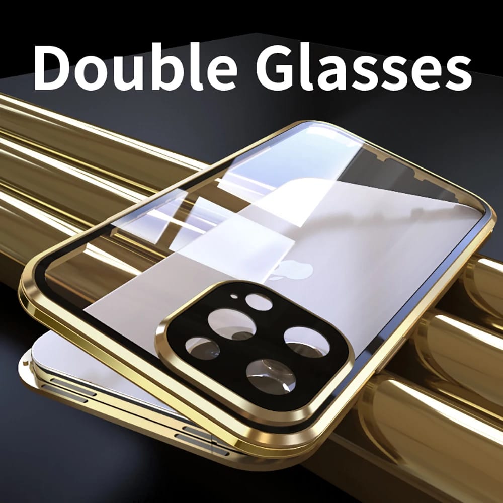 Grab this Premium Metallic Gold Plated 360 Degrees Protection Transparent Glass Cover in a sleek new design for iPhone 14, iPhone 14 Plus, iPhone 14 Pro, iPhone 14 Pro Max, iPhone 15, iPhone 15 Plus, iPhone 15 Pro, iPhone 15 Pro Max,