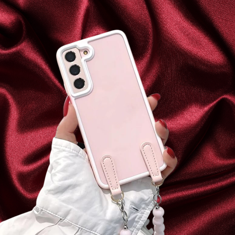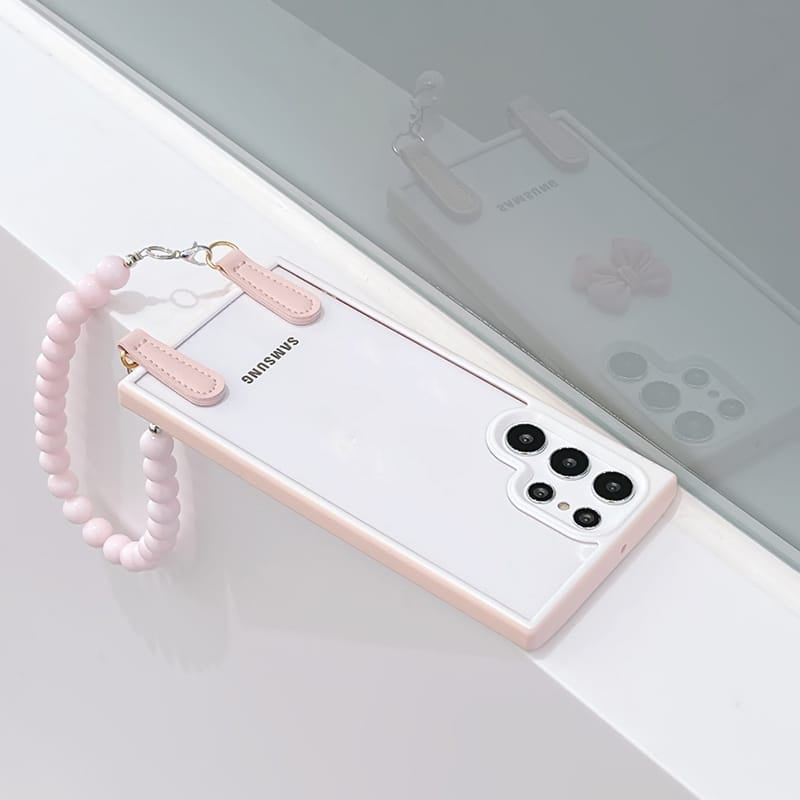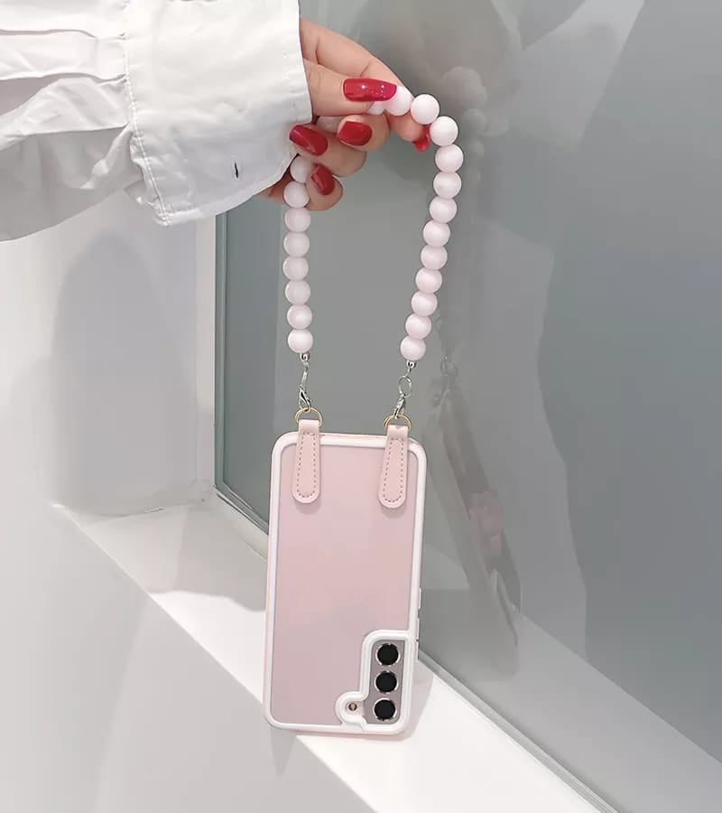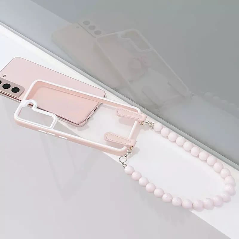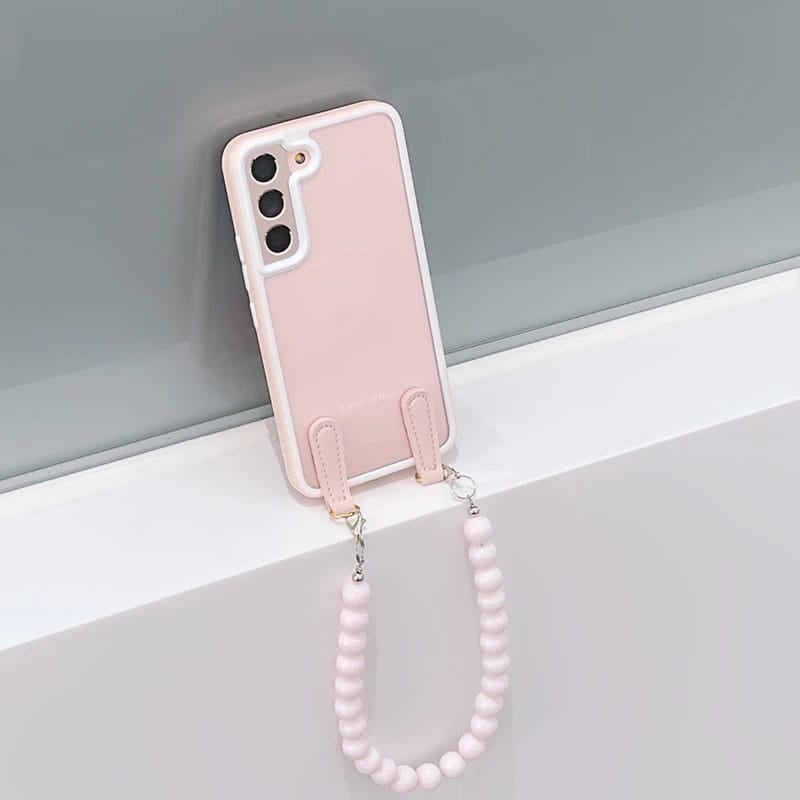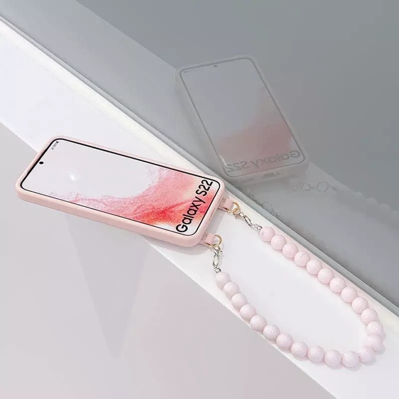 Pink Pearls Bracelet Holder Transparent Cover in a sleek new design for the Samsung Galaxy S22, Samsung Galaxy S22 Plus, and Samsung Galaxy S22 Ultra.