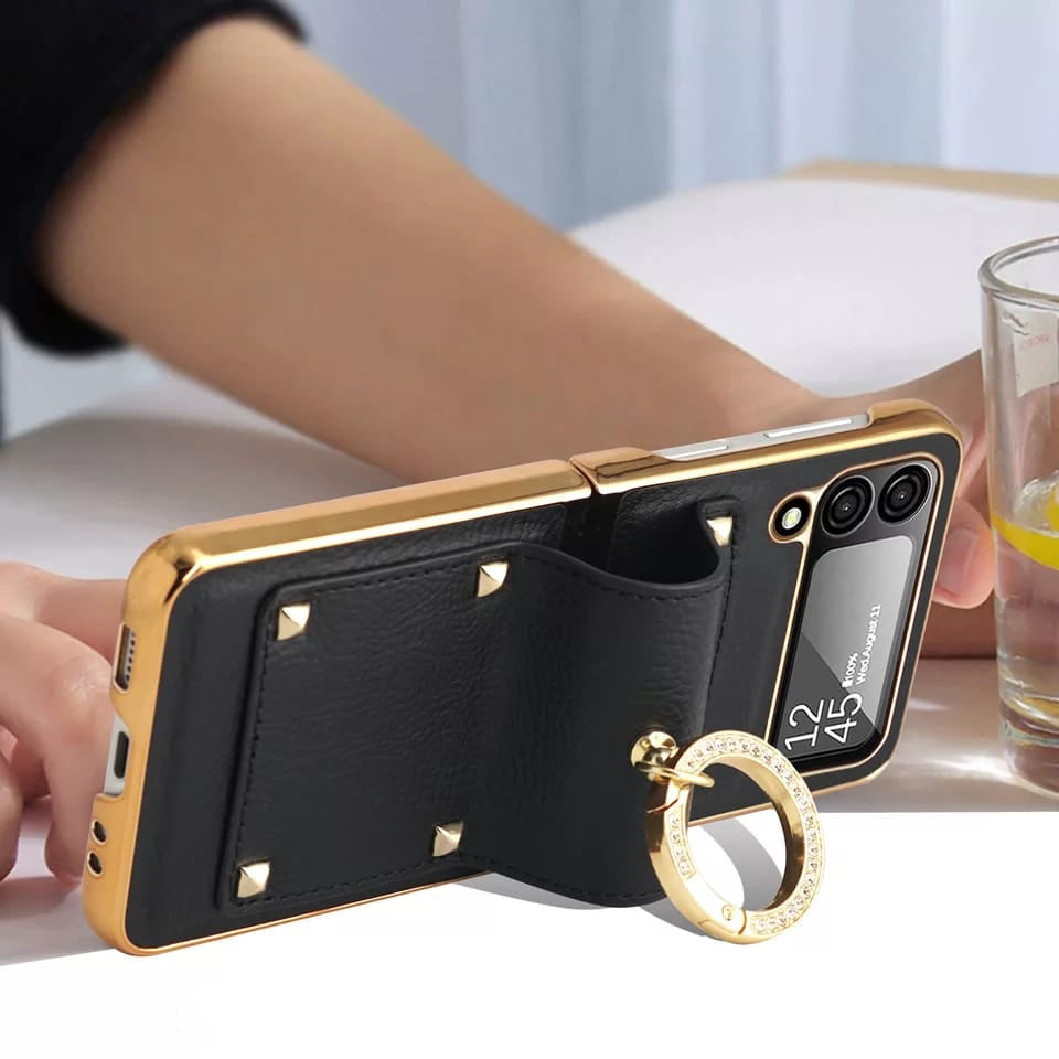 Ring Holder Gold Electroplated Premium Leather Case in a sleek new design for the Samsung Galaxy Z Flip 4.